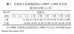 根据脊髓损伤后mMEP的特点,分别选取损伤后的mMEP波幅百分比与BBB评分作相关分析。结果表明,实验组大鼠脊髓损伤后1~6周,mMEP与BBB分呈中度至高度相关(r值为0.718~0.951, P值均<0.05),见表5。