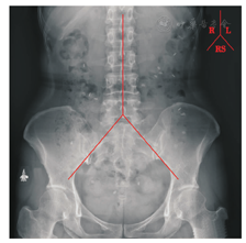 嘱患者于检查前3 d停用泻剂及影响胃肠运动的药物和食物,检查期间保持正常生活及饮食习惯,记录每一次的排便次数和时间。检查当日晨起早饭后吞服1粒胃肠动力标记物胶囊(北京镜缘博通医疗器械有限公司,每粒胶囊含24枚硫酸钡钡环),应用简易法于48 h后行腹部立位平片[11]。按照Arhan的读片方法[12]:从第12胸椎棘突至第5腰椎棘突作连线(腹中线),再从第5腰椎棘突向骨盆出口两侧做切线,将结肠分为左半结肠区(L),右半结肠区(R)和直肠乙状结肠区(RS)3个区域,通过对这3个区域标记物分布情况,进一步明确功能性便秘的分型(图1)。