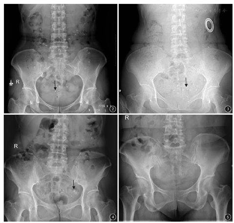 65例慢性功能性便秘患者中,慢传输型32例(图2),出口梗阻型13例(图3),混合型便秘2例(图4),正常传输型18例(图5)。其中2例慢传输型患者及5例出口梗阻型患者治疗过程中失访;随访成功58例患者,按其分型诊断接受了不同的治疗:出口梗阻型患者8例,经排粪造影及胃肠外科就诊,确定直肠前突及黏膜内脱垂,接受吻合器痔上黏膜环切钉合术,术后4周7例患者治疗有效,肛门梗阻及会阴部坠胀感改善;30例慢传输型、2例混合型及18例正常传输型患者经保守治疗后,治疗有效患者分别为28例、2例、16例,排便困难及腹痛、腹胀改善(见表1)。无效5例。