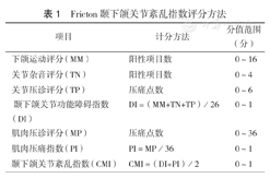 所有纳入研究的患者均于术前及术后1个月行颞下颌关节功能检查,检查标准按Fricton颞下颌关节功能紊乱指数(CMI)进行评分,检查内容包括下颌运动、关节杂音、关节区触诊及咀嚼肌、头颈部肌肉的触诊[5,6]。CMI包括颞下颌关节功能障碍指数(DI)和肌肉压痛指数(PI),其具体评分标准见表1。根据手术前后患者CMI的变化评价颞下颌关节的功能状态。