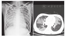73例患儿中,66例肺出血后2 h内完善床旁胸片或CT。61例胸部平片提示双肺透过度减低、多发渗出性病变(其中4例并胸腔积液,2例并气胸,5例高密度斑片影以左肺为主,4例高密度斑片影以右肺为主)。5例双肺纹理增强。图1为1例暴发性心肌炎并肺出血胸片,图2为相同患者的CT。