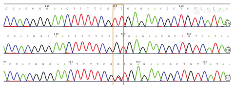 2017年8月19日,本例患儿口腔上皮组织和血液样本的STR-PCR检测结果显示,患儿口腔上皮组织和血液样本的STR基因型不同,表明患儿血液中存在供血者来源的细胞植入,血液中细胞基因型已经不同程度转变为供血者基因型或者供受血者混合型,因此,对本例患儿确诊为TA-GVHD。2017年9月18日,患儿血液样本的免疫缺陷病突变基因测序结果显示,IL2RG基因(NM_000206.2)存在剪切位点变异c.924+1G>T(半合子,X染色体),其母亲携带IL2RG基因杂合突变,父亲的IL2RG基因为野生型。综合上述检查结果,对本例患儿进一步确诊为X-连锁IL2RG基因缺陷所致的重症联合免疫缺陷病合并TA-GVHD。本例患儿口腔上皮组织和血液样本的STR-PCR检测结果,见表1。本例患儿及其父母血液样本的免疫缺陷病突变基因测序结果,见图1。
