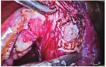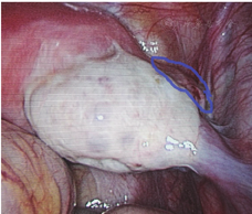 患者,32岁,因"停经2月余,下腹隐痛1 d"于2017.03.02入院。末次月经2016.12.23,入院当日出现下腹隐痛,无阴道流血,无肛门坠胀感,无恶心,无呕吐等不适。既往生育史:0-0-3-0,2015年因右侧输卵管妊娠行腹腔镜下右侧输卵管切除术。妇科检查:外阴已婚式;阴道畅;宫颈轻度糜烂,举痛不明显;宫体前位,饱满,无压痛;右侧附件压痛,未及明显包块,左侧附件未及压痛,未及包块。2017.03.02查血hCG为14 621.28 IU/L,孕酮为21.30 nmol/L。阴道B超结果提示:紧贴子宫右侧角混合性占位27 mm×26 mm×25 mm,边界模糊,内见无回声区17 mm×17 mm×14 mm,2017.03.03行腹腔镜下手术,术中见子宫前位,饱满,左侧附件未见异常,右侧输卵管未见,右侧卵巢3 cm×2 cm×2 cm,致密粘连于右侧宫角,右侧近宫角处的阔韧带上见一直径约3 cm的包块,逐步切开包块,取出绒毛样组织,创面缝合(图3)。术后17 d血hCG下降至正常,恢复好。