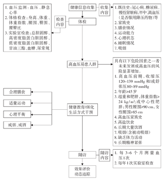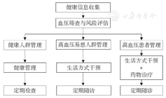 高血压健康管理的模式分为3个层面:(1)自我健康管理:个人是践行健康的第一责任人,做好自我健康管理,提高健康素养和自我保健意识,定期监测个人健康状况,针对危险因素进行筛查评估,采取针对性的干预措施,及时评价健康管理效果。倡导18岁及以上人群知晓个人血压。在有条件的社区,推广家庭血压测量,鼓励高血压患者记录"血压日记",规律记录血压及脉率情况。试用推广"互联网+血压管理"。居民自行测量血压并利用智能终端设备上传数据,实现家庭自我健康管理和医生远程管理相结合。(2)基层医疗卫生机构规范管理:家庭医生是居民健康的守门人。以基层医疗卫生机构家庭医生团队为主体,针对高血压易患人群和患者进行规范管理。建立居民健康档案,对高血压易患人群进行筛查、干预、评估。对已患高血压的人群,积极进行降压治疗,避免并发症发生,改善预后,提高生活质量。对患者进行定期随访,跟踪血压水平、用药情况、不良反应,关注心率、血脂、血糖、体重等其他危险因素及其干预、临床情况处理等。根据患者血压是否达标进行分级管理,对未达标的患者重点管理,提高血压控制率。(3)上级医疗机构重点管理:依托我国现有的国家、省、市、县慢性病防治机构和高血压专病医联体资源,由三级医院、二级医院和基层医疗卫生机构的医生组成区域性高血压管理团队,针对基层血压控制不佳、管理效果较差的患者,通过分级诊疗机制转诊到上级医疗机构进行重点管理。同时,上级医疗机构为基层高血压患者的长期监测和管理提供技术支持与培训,对高血压健康管理工作进行质量控制和评价。
