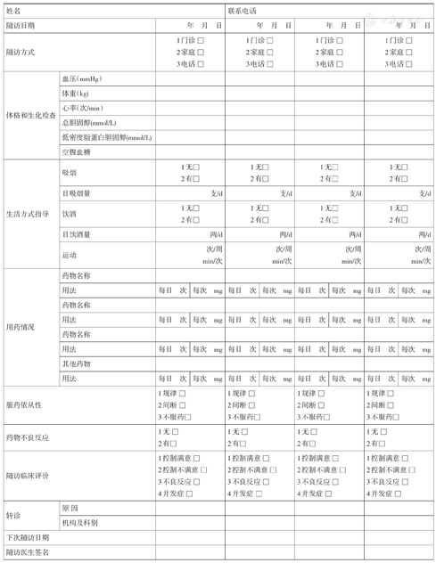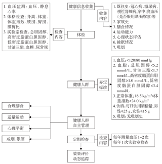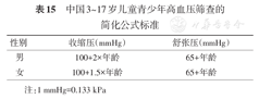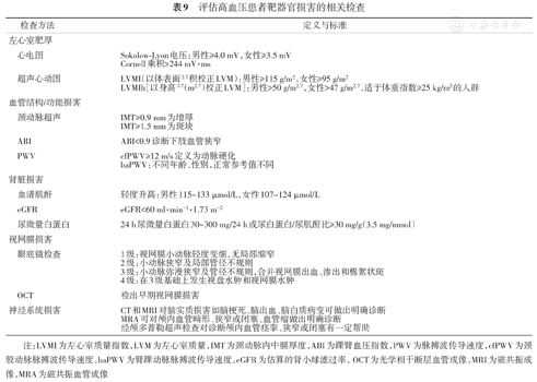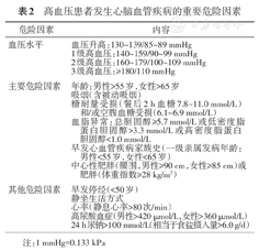 | 其他危险因素 | 早发停经(<50岁)静坐生活方式心率(静息心率>80次/min)高尿酸血症(男性>420 μmol/L,女性>360 μmol/L)24 h尿钠>100 mmol/L(相当于食盐摄入量>6.0 g/d) |