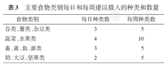| 食物类别 | 每日种类数 | 每周种类数 |