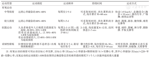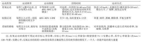 (1)一次锻炼的基本组成:一次运动锻炼的基本组成包括准备活动(也叫热身)、运动内容、整理放松和拉伸运动4部分(表4)。(2)运动种类:有氧运动,也称为心肺耐力运动,以有氧代谢为主要供能途径,指全身大肌肉群参与的、有节律性、持续一定时间的运动形式。如快走、跑步、游泳、骑自行车、广场舞、太极拳(剑)、广播操、乒乓球等球类运动。抗阻运动,主要指肌肉强化运动,能够保持或增强肌肉力量和耐力以及肌肉体积的运动,同时也是增强骨骼强度的锻炼方式。运动时肌肉对抗一定阻力或举起一定负荷的重量,肌肉做功要大于日常生活,即超负荷。由于每种动作或训练只增强参与做功的肌肉,因此要通过多种动作或训练以使身体各部位肌肉平衡发展。抗阻运动一般不规定运动时间,但强调需运动到不能完整、正确地完成动作为止。如俯卧撑、平板支撑、器械练习、弹力带练习等。柔韧性练习,伸展、牵伸等练习可增大关节活动范围,如压腿、运动健身器械上的牵拉等。神经肌肉练习,也称为神经肌肉控制练习,包括平衡、协调、步态和本体感觉等控制技能的练习,如闭眼单脚站、太极拳、气功、舞蹈等。(3)运动量:身体活动量要达到中等强度以上才会产生健康效应[23,24]。中等强度运动,即心率为达到心率储备的40%~60%,如快步走、骑自行车(速度低于16 km/h)、瑜伽、舞蹈等。较大强度运动,即心率达到心率储备的60%~80%,如跑步、游泳、骑自行车(速度≥16 km/h)、跳绳、高强度间歇训练、健美操等。每周建议150~300 min的中等强度运动或75~150 min的较大强度运动,每周建议有2 d进行肌肉强化锻炼,以保持健康。增加身体活动量,即每周≥300 min的中等强度运动可获益更多。可凭自身感觉简单判断运动强度:与安静状态相比,呼吸、心率微微加快,微微气喘,但能讲话而不能唱歌,基本达到中等强度;呼吸、心跳明显加快,气促,不能连贯讲话,基本达到较大强度。