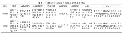 | 日间组 | 诊断当日预约,平均等床时间1个月 | 普外门诊完成术前检查检验 | 日间专科医生询问病史,主刀医生确认,当日完成 | 按部位及年龄安排,时间安排误差小 | 门诊复苏室 | 由专科护士评估,日间专科住院负责 | 术后宣教完毕,患儿病情稳定后出院 | 术后2~3 d换药,7 d拆线,术后1个月复查腹股沟及阴囊区彩色多普勒超声,术后半年我院随访 |