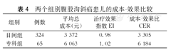 | 组别 | 例数 | 平均总成本(元) | 治疗效果指数EI | 成本-效果比CER |