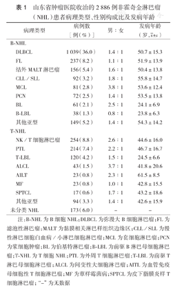 山东省肿瘤医院收治的2 886例非霍奇金淋巴瘤(NHL)患者病理类型、性别构成比及发病年龄