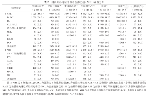 国内外各地区非霍奇金淋巴瘤(NHL)亚型分布