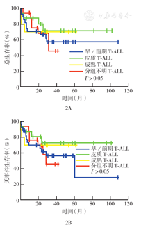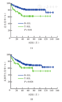 T-ALL与B-ALL两组患儿5年OS率分别为(62.1±6.4)%、(81.3±2.4)%,5年EFS率分别为(61.0±6.3)%、(71.0±2.7)%,两组OS和EFS差异均有统计学意义(均P<0.05)(图1)。