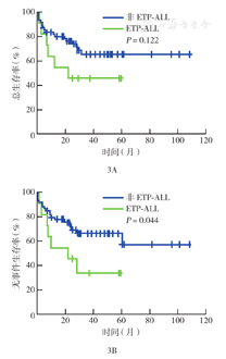 按照EGIL标准,T-ALL各亚型间OS和EFS差异均无统计学意义(均P>0.05)(图2)。早期前体T淋巴细胞(ETP)-ALL患儿与非ETP-ALL患儿OS间差异无统计学意义(P=0.122),而EFS间差异有统计学意义(P=0.044)(图3)。