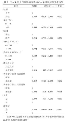 T-ALL患儿预后影响因素的Cox单因素回归分析结果