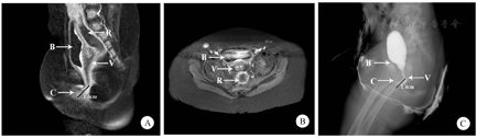 注:B,膀胱;R,直肠;C,共同通道;V,阴道;黑色线段,指示共同通道长度