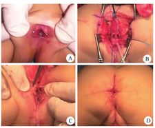 新生儿期首诊的患儿共16例(51.61%)。在全部31例中,3例就诊时外院已行结肠造口术,均为高位畸形患儿。其中1例首诊我院前外院已行根治术并已关闭造口,但尿道阴道重建失败,导致医源性尿道闭锁,该例带外院膀胱造瘘管入院。另1例患儿外院造口后尝试根治,但仅成形肛门,尿生殖窦未分离。28例就诊我院经过评估后行结肠造口术,其中1例低位畸形及1例高位畸形患儿在结肠造口同时行膀胱造瘘及阴道造瘘术。1例Ⅰ型畸形、2例低位畸形及1例高位畸形患儿首诊评估后即行根治手术,21例在二次评估后行根治手术(图1)。本研究全部31例中,有25例最终接受根治手术,具体情况见表3。典型手术过程见图3。