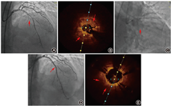 注:患者女性,62岁,胸痛10年加重24 h入院,诊断非ST段抬高型心肌梗死,既往高血压、PCI病史,射血分数61%,因球囊通过后无法充分扩张钙化病变故行ELCA治疗。A图为冠状动脉造影显示左主干末段至中段弥漫狭窄伴管腔重度钙化,箭头所示为前降支中段狭窄最重处;B图为OCT提示钙化(箭头所示)角度>270 °,厚度>1 mm,管腔面积1.20 mm2;C图为1.4 mm激光导管(箭头所示)消融3次(1次40 Hz 50 J/cm2, 2次60 Hz 60 J/cm2)后成功置入直径2.5 mm、长度33 mm和直径3.0 mm、长度23 mm的2枚药物洗脱支架;D图为造影显示残余狭窄<10%,箭头所示为术前前降支中段狭窄最重处;E图为复查OCT示狭窄最窄处,管腔面积明显增加,支架膨胀、贴壁良好,钙化斑块被支架完全覆盖(箭头所示)