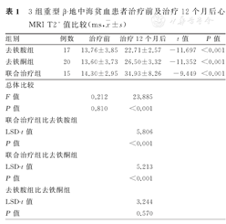 3组患者治疗12个月后,其心MRI T2*值分别较治疗前升高,并且差异均有统计学意义(去铁胺组:t=-11.697,P<0.001;去铁酮组:t=-11.352,P<0.001;联合治疗组t=-9.449,P<0.001)。治疗12月后,3组患者心MRI T2*值比较,总体差异有统计学意义(F=23.885,P<0.001)。其中,联合治疗组患者心MRI T2*值,分别高于去铁胺组及去铁酮组,并且差异均有统计学意义(联合治疗组比去铁胺组:LSD-t=5.806,P<0.001;联合治疗组比去铁酮组:LSD-t=5.213,P<0.001),去铁胺组及去铁酮组患者心MRI T2*值比较,差异无统计学意义(LSD-t=3.244,P=0.570)。3组患者治疗前及治疗12个月后心MRI T2*值比较,见表1。