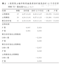 3组患者治疗12个月后,肝MRI T2*值均较治疗前升高,并且差异均有统计学意义(去铁胺组:t=-12.378,P<0.001;去铁酮组:t=-13.384,P<0.001;联合治疗组:t=-12.619,P<0.001)。治疗12个月后,3组患者肝MRI T2*值比较,总体差异无统计学意义(F=2.423,P=0.099)。其中,联合治疗组患者肝MRI T2*值分别大于去铁胺组及去铁酮组,并且差异均有统计学意义(联合治疗组比去铁胺组:LSD-t=-2.339,P=0.026;联合治疗组与去铁酮组比较LSD-t=-2.057,P=0.048),去铁胺组及去铁酮组心MRI T2*值比较,差异无统计学意义(LSD-t=-0.910,P=0.928)。3组患者治疗前及治疗12个月后肝MRI T2*值比较,见表2。