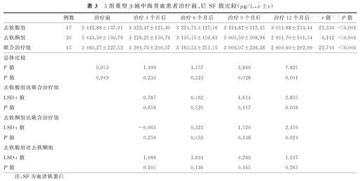 治疗12个月后,3组患者SF值分别与治疗前比较均显著降低,并且差异均有统计学意义(去铁胺组:t=22.33,P<0.001;去铁酮组:t=6.142,P<0.001;联合治疗组:t=22.744,P<0.001)。治疗12个月后,3组患者SF值比较,总体差异有统计学意义(F=7.825,P=0.001)。其中,联合治疗组SF值分别显著低于去铁胺组及去铁酮组,差异均有统计学意义(联合治疗组比去铁胺组:LSD-t=2.855,P=0.008;联合治疗组比去铁酮组:LSD-t=2.359,P=0.024),去铁胺组及去铁酮组SF值比较,差异无统计学意义(LSD-t=-1.137,P=0.263)。3组患者治疗3、6、9个月后SF值分别比较,总体差异均无统计学意义(P>0.05)。3组患者治疗前、后SF值比较,见表3。