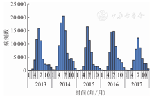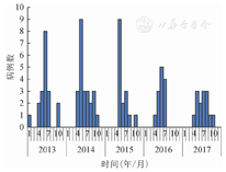 (2)时间分布:2013-2017年河北省手足口病发病呈明显的季节性分布。每年4月开始,发病人数逐渐上升,5-7月达到最高峰。见图1。每年均有其他肠道病毒手足口病重症病例报告,2013年和2017年各报告1例死亡病例。病例发病时间主要集中于4-10月,5-7月达到发病高峰。见图2。