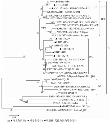 2013-2017年河北省其他肠道病毒手足口病重症和死亡病例在发病时间上呈现季节性,与手足口病流行的整体趋势一致。CoxA6属于D3基因型,且未出现新的进化分支。