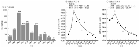 使用死亡率和病死率年度变化百分比(annual percentage change,APC)描述手足口病死亡病例随时间变化趋势。APC是一种可以用于描述疾病发病率、死亡率、病死率等时间变化的指标,假设在所研究的时间段内,疾病每年的发病率、死亡率、病死率按照固定的对数线性百分比上升或下降,并通过假设检验,确定APC是否有统计学意义。使用Join point 4.0.4软件,采用Age Adjusted Rate Calculation Session模型[14],对标化后的死亡率和病死率进行多阶段回归分析,计算APC,率的标化使用2018年中国各年龄段人口数作为标准人口。将各省份手足口病年度死亡病例按照2008-2010、2011-2013、2014-2016和2017-2018年分段汇总,使用Arc GIS Map 10.5软件绘制地图。