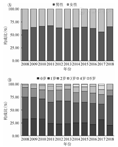 死亡病例中,男性2 355例,女性1 291例,性别比为1.82∶1,各年度性别构成均男性高于女性,差异无统计学意义(图2A)。年龄范围7 d~71月龄,M=19月龄,主要集中在≤2岁组(87.71%),1岁组人数最多(40.76%);不同年份年龄构成略有不同,2018年死亡病例均为0~3岁婴幼儿,其中1岁组仍占比最大,为57.14%(图2B)。