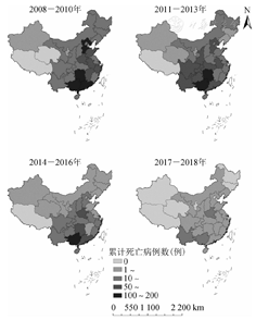 死亡病例数在50~例的省份由2008-2010年的5个省份(浙江省、安徽省、江西省、山东省和河南省)在2011-2013年上升至8个省份(河北省、安徽省、湖北省、重庆市、四川省、贵州省、云南省和陕西省),之后在2014-2016年下降至3个省份(河南省、湖南省和广东省)。死亡病例数为10~例的省份由2008-2010年的17个省份,降至2017-2018年的3个省份。而死亡数1~例的省份由2008-2010年3个省份,增至2017-2018年的19个省份。见图3。