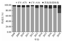 2 523例实验室确诊死亡病例中,2 323例(92.07%)由EV-A71引起,49例(1.90%)为CV-A16,151例(6.03%)为其他肠道病毒。不同年份病原构成略有变化,各年度虽均以EV-A71为优势病原,但其他肠道病毒构成呈增加趋势,2018年CV-A16引起死亡病例构成明显增加,2015-2017年CV-A16构成比平均水平为2.14%,2018年构成比增加至17.65%(图4)。
