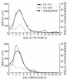手足口病死亡病例发病至诊断时间间隔、发病至死亡时间间隔M=2(P25~P75:2~4)和3(P25~P75:2~4)d;不同病原引起的死亡病例发病与死亡时间间隔分布相似,均M=3(P25~P75:2~4)d;而发病至诊断时间间隔略有不同,EV-A71、其他肠道病毒和CV-A16引起的死亡病例发病至诊断时间间隔M=2(P25~P75:2~4)、2(P25~P75:2~3.5)和1(P25~P75:1~4)d。见图5。