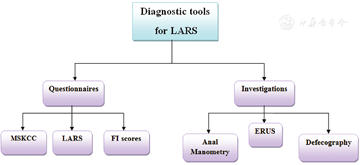 LARS should be suspected in patients who develop one or more bowel symptoms after undergoing SPS. The diagnosis is confirmed when the symptoms persist more than 1 month after surgery after exclusion of any alternative etiology. It is essential to assess the anorectal function from patient’s perspective because there is misunderstanding of LARS symptoms and its effect on the QoL among rectal cancer experts. Thus, there is a need for questionnaires. Many questionnaires have been proposed for assessing bowel function. The most suitable tools for assessing the bowel function after rectal cancer surgery are the LARS score and the MSKCC BFI.[45] The diagnostic tools of LARS are shown in Figure 1.