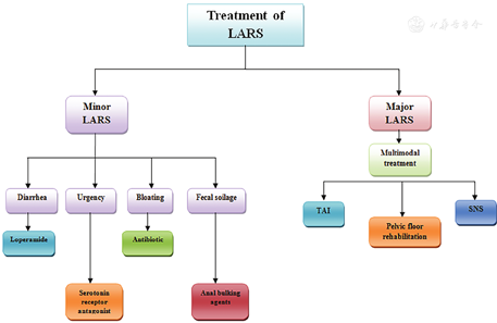 Major LARS has a significant negative impact on patients' QoL. Those patients typically require multimodal therapy rather than medical treatment for individual symptoms. Multimodal therapy comprises TAI at least 3 to 4 times/week plus pelvic floor rehabilitation (biofeedback, pelvic floor muscle training, balloon training, and electrostimulation). This treatment should continue for (6 months–1 year) and then patients should be re-evaluated using the questionnaire again. If symptoms of major LARS improved, persistent minor symptoms can be treated medically. Patients who continue to have major LARS >1 year of multimodal therapy should be treated with neurostimulation (sacral nerve stimulation [SNS]). Patients who do not respond to neurostimulation and have severely compromised QoL more than 2 years from the start of multimodal therapy should be offered a diverting stoma.[59]