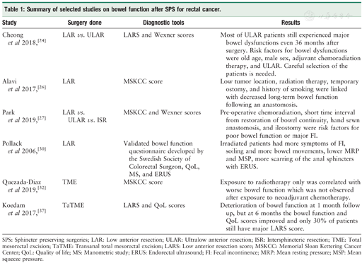 Summary of selected studies on bowel function after SPS for rectal cancer.
