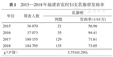 乳腺癌是一种具有高发病率特征的恶性肿瘤,已成为当今社会的重大健康问题。全国肿瘤登记中心的数据表明,我国女性乳腺癌发病率及死亡率均呈上升趋势[1]。2015年我国女性乳腺癌新发病例高达26.86万,死亡6.95万[2]。乳腺癌病程较缓慢,有较为可行的检查诊断方法,适宜群体筛查。通过筛查可以提高乳腺癌的早诊率,达到降低死亡率的目的。随着诊疗水平的提高和社会对肿瘤筛查认知意识的增强,临床上对乳腺癌的早期诊断越发重视。本研究对福建省2015—2018年农村地区35~64岁妇女开展免费乳腺癌的筛查,现将筛查情况报道如下。