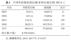 对比发病年龄与原位癌/非原位癌的关系,发现非原位癌患者发病年龄较大[发病年龄(50.0±6.3)岁;原位癌患者发病年龄则为(46.04±7.1)岁],其差异有统计学意义(t=2.833,P=0.000 5);2015—2017年原位癌/非原位癌的构成比例差异无统计学意义(P=0.537)。加入2018年数据后,原位癌构成比例整体上呈现上升趋势(表3)。