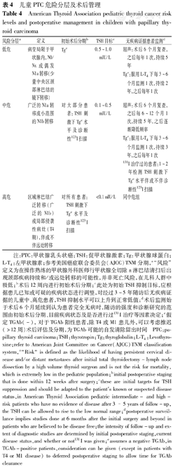 注:PTC:甲状腺乳头状癌;TSH:促甲状腺激素;Tg:甲状腺球蛋白;L-T4:左甲状腺素;参考美国癌症联合委员会(AJCC)TNM分期,a"风险"定义为在操作熟练的甲状腺外科医师行甲状腺全切除±淋巴结清扫后出现颈部疾病持续和/或远处转移的可能性,并非死亡风险,在儿科人群中极低;b术后12周内进行初始术后分期;c此处为初始TSH抑制目标,应根据患儿已知或可疑的疾病状态进行调整,对经过3~5年随访后无疾病证据的儿童中、高危患者,TSH抑制水平可以上升到正常低值;d术后监测始于术后6个月延续到认为患者完全无病时,随访的强度和诊断研究的范围由初始术后分期、目前疾病状态及是否进行过131I治疗等因素决定;e假定TGAb(-),对于TGAb阳性患者,除T4或M1患儿外,可以考虑推迟(>12周)术后评估及分期,为TGAb可能的自发清除留出时间 PTC:papillary thyroid carcinoma;TSH:thyrotropin;Tg:thyroglobulin;L-T4:Levothyro-xine;refer to American Joint Committee on Cancer(AJCC)TNM classification system,a"Risk"is defined as the likelihood of having persistent cervical di-sease and/or distant metastases after initial total thyroidectomy-lymph node dissection by a high volume thyroid surgeon and is not the risk for mortality,which is extremely low in the pediatric population;binitial postoperative staging that is done within 12 weeks after surgery;cthese are initial targets for TSH suppression and should be adapted to the patient′s known or suspected disease status,in American Thyroid Association pediatric intermediate- and high-risk patients who have no evidence of disease after 3-5 years of follow-up,the TSH can be allowed to rise to the low normal range;dpostoperative surveillance implies studies done at 6 months after the initial surgery and beyond in patients who are believed to be disease free;the intensity of follow-up and extent of diagnostic studies are determined by initial postoperative staging,current disease status,and whether or not131I was given;eassumes a negative TGAb,in TGAb-positive patients,consideration can be given (except in patients with T4 or M1 disease) to deferred postoperative staging to allow time for TGAb clearance