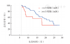 本研究FAS中位治疗时间为6个周期,治疗≥6个周期的患者占50%(36/72),Du等[10]研究中国较高危MDS患者中位治疗时间为6~8个周期,治疗≥6个周期患者比例为57%~64%,本研究中,FAS中位OS期为16.1(95%CI 10.9~20.6)个月,而治疗≥ 6个周期的36例患者,中位OS期可达22.3(95%CI 16.1~不可估计)个月。