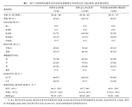 | 基线特征 | 本研究全分析集(72例) | 原研AZA-001队列[5](179例) | 中国HR-MDS原研2期试验[10](72例) | |