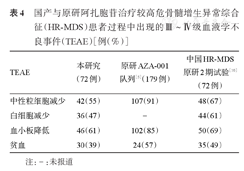 本研究是首个报道国产阿扎胞苷数据的前瞻性研究,从疗效、安全性和药代动力学特征三方面与原研中国人群数据进行了比较。本研究设计及基线人群特征(表1)与原研中国人群数据研究相似,研究终点略有不同。