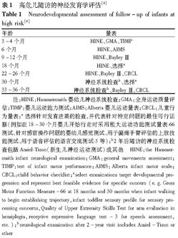 注:HINE:Hammersmith婴幼儿神经系统检查;GMA:全身运动质量评估;TIMP:婴儿运动能力测试;AIMS:Alberta婴儿运动量表;CBCL:儿童行为量表;a选择针对发育进展的检查,并代表针对特定问题的最佳可行证据(例如在18~30个月婴儿开始行走时采用粗大运动功能测试量表-66测试、针对感官操作问题的婴幼儿感觉测试、用于偏瘫手臂评估的上肢技能测试、用于语音评估的语言交流测试-3等);b2年后随访的神经系统检查包括Amiel-Tison(新生儿神经运动测试)或其他