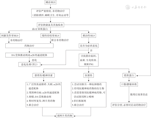 在进行RLS的治疗前需首先评估可能加重RLS症状的潜在因素,尽可能消除或减少这些继发性因素的影响。