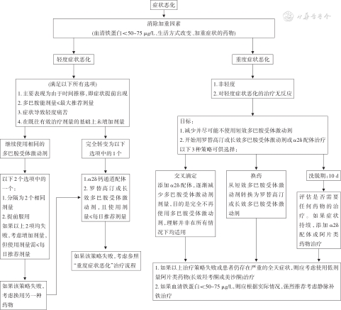 1.症状恶化:症状恶化是RLS严重的并发症之一,其主要特征是症状严重程度增加,可在一天中更早的时间出现。Max Planck学会针对症状恶化制定了如下诊断标准,需满足A+B或A+C或A+B+C标准:A.基本特征:①在过去的1周内,至少5 d症状严重程度有所增加;②症状严重程度的增加不能由其他因素来解释,如躯体疾病、生活方式改变或疾病自然进展;③既往治疗有效。B.对药物治疗存在反常反应,即RLS症状在增加药物剂量时加重,在减少剂量时改善。C.症状出现较早:①症状提前发作至少4 h,或②与治疗前的症状相比,症状发作提前(2~4 h),表现为下列一项以上:a. 休息时症状潜伏期缩短;b. 症状蔓延到其他身体部位;c. 症状强度增加;d. 治疗后持续缓解的时间缩短[103, 104]。症状恶化最常见的危险因素包括:铁缺乏、高剂量多巴胺能制剂治疗,尤其是半衰期较短的药物(症状恶化出现程度:左旋多巴>速释多巴胺受体激动剂>缓释多巴胺受体激动剂)、起病时症状的严重程度(即治疗前症状更为频繁和严重)、长期接受RLS药物治疗、高龄和较少咨询专业医生[103, 104] (症状恶化的治疗流程如图2所示)。