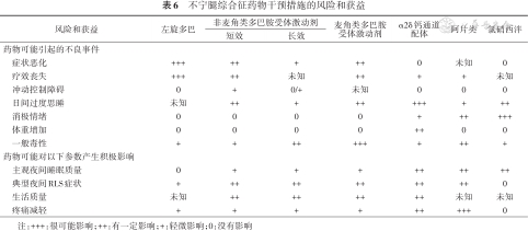 | 风险和获益 | 左旋多巴 | 非麦角类多巴胺受体激动剂 | 麦角类多巴胺 受体激动剂 | α2δ钙通道 配体 | 阿片类 | 氯硝西泮 | |