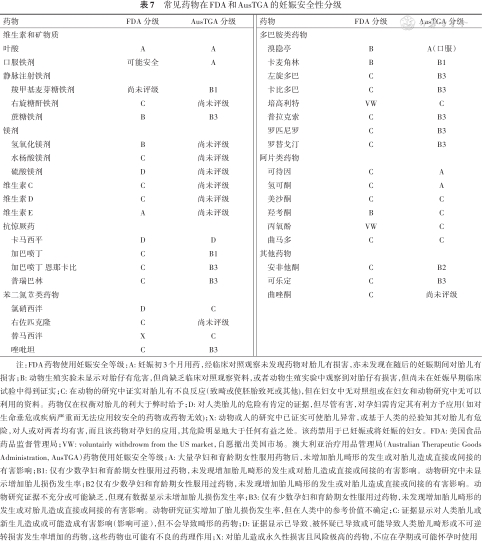注:FDA药物使用妊娠安全等级:A: 妊娠初3个月用药,经临床对照观察未发现药物对胎儿有损害,亦未发现在随后的妊娠期间对胎儿有损害;B: 动物生殖实验未显示对胎仔有危害,但尚缺乏临床对照观察资料,或者动物生殖实验中观察到对胎仔有损害,但尚未在妊娠早期临床试验中得到证实;C: 在动物的研究中证实对胎儿有不良反应(致畸或使胚胎致死或其他),但在妇女中无对照组或在妇女和动物研究中无可以利用的资料。药物仅在权衡对胎儿的利大于弊时给予;D: 对人类胎儿的危险有肯定的证据,但尽管有害,对孕妇需肯定其有利方予应用(如对生命垂危或疾病严重而无法应用较安全的药物或药物无效);X: 动物或人的研究中已证实可使胎儿异常,或基于人类的经验知其对胎儿有危险,对人或对两者均有害,而且该药物对孕妇的应用,其危险明显地大于任何有益之处。该药禁用于已妊娠或将妊娠的妇女。FDA: 美国食品药品监督管理局;VW: voluntairly withdrowm from the US market,自愿撤出美国市场。澳大利亚治疗用品管理局(Australian Therapeutic Goods Administration, AusTGA)药物使用妊娠安全等级:A: 大量孕妇和育龄期女性服用药物后,未增加胎儿畸形的发生或对胎儿造成直接或间接的有害影响;B1: 仅有少数孕妇和育龄期女性服用过药物,未发现增加胎儿畸形的发生或对胎儿造成直接或间接的有害影响。动物研究中未显示增加胎儿损伤发生率;B2仅有少数孕妇和育龄期女性服用过药物,未发现增加胎儿畸形的发生或对胎儿造成直接或间接的有害影响。动物研究证据不充分或可能缺乏,但现有数据显示未增加胎儿损伤发生率;B3: 仅有少数孕妇和育龄期女性服用过药物,未发现增加胎儿畸形的发生或对胎儿造成直接或间接的有害影响。动物研究证实增加了胎儿损伤发生率,但在人类中的参考价值不确定;C: 证据显示对人类胎儿或新生儿造成或可能造成有害影响(影响可逆),但不会导致畸形的药物;D: 证据显示已导致、被怀疑已导致或可能导致人类胎儿畸形或不可逆转损害发生率增加的药物,这些药物也可能有不良的药理作用;X: 对胎儿造成永久性损害且风险极高的药物,不应在孕期或可能怀孕时使用