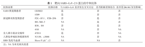 | 抗体来源 | 抗体名称 | 与SARS-CoV是否发生交叉反应 | 是否阻断受体结合 | 是否受D614G突变影响 |
