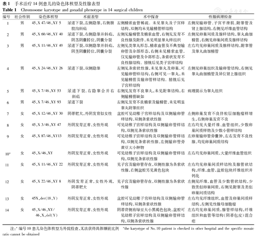 14例已手术患儿的具体染色体核型及其嵌合比例、性腺表型、病理结果见表1。此14例患儿已选择行预防性性腺切除术,其中6例社会性别男性,8例社会性别女性。