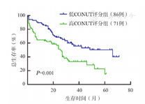 截至末次随访,有完整随访资料的157例患者中存活76例(48.41%),死亡81例(51.59%),中位OS时间31(95%CI 21.5~40.5)个月。PNI≤44.45患者的中位OS时间为26.5(95%CI20.9~32.1)个月,PNI>44.45患者的中位OS时间未达到,差异有统计学意义(P<0.001)(图2)。CONUT≤3.5患者的中位OS时间为66(95%CI 26.8~105.2)个月,CONUT>3.5组患者中位OS时间为25.5(95%CI 22.2~28.8)个月,差异有统计学意义(P=0.001)(图3)。