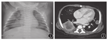 实验室检查:血常规示白细胞为(17.18~27.00)×109/L,血红蛋白、血小板正常,C反应蛋白最高135 mg/L;肝肾功能正常,降钙素原0.42 μg/L;血免疫球蛋白IgM 、IgG 、IgA、IgE正常;流式淋巴细胞亚群分类均正常;铁蛋白1 111 μg/L。血巨细胞病毒抗体阴性,1,3-β-D葡聚糖(G试验)阴性,血清半乳甘露聚糖(GM试验)2.13 μg/L(正常范围0~0.85 μg/L),γ-干扰素释放试验、血培养阴性。痰抗酸染色、真菌荧光染色、痰培养均阴性。胸片示双肺多发片状高密度影(图1)。胸CT平扫及强化示双肺多发软组织密度团块影及结节影伴边缘强化,纵隔内、右侧肺门及双侧腋窝多发淋巴结影并部分增大(图2)。胸部彩超示右侧胸腔实性包块,范围7 mm×26 mm×23 mm,考虑肺脓肿。