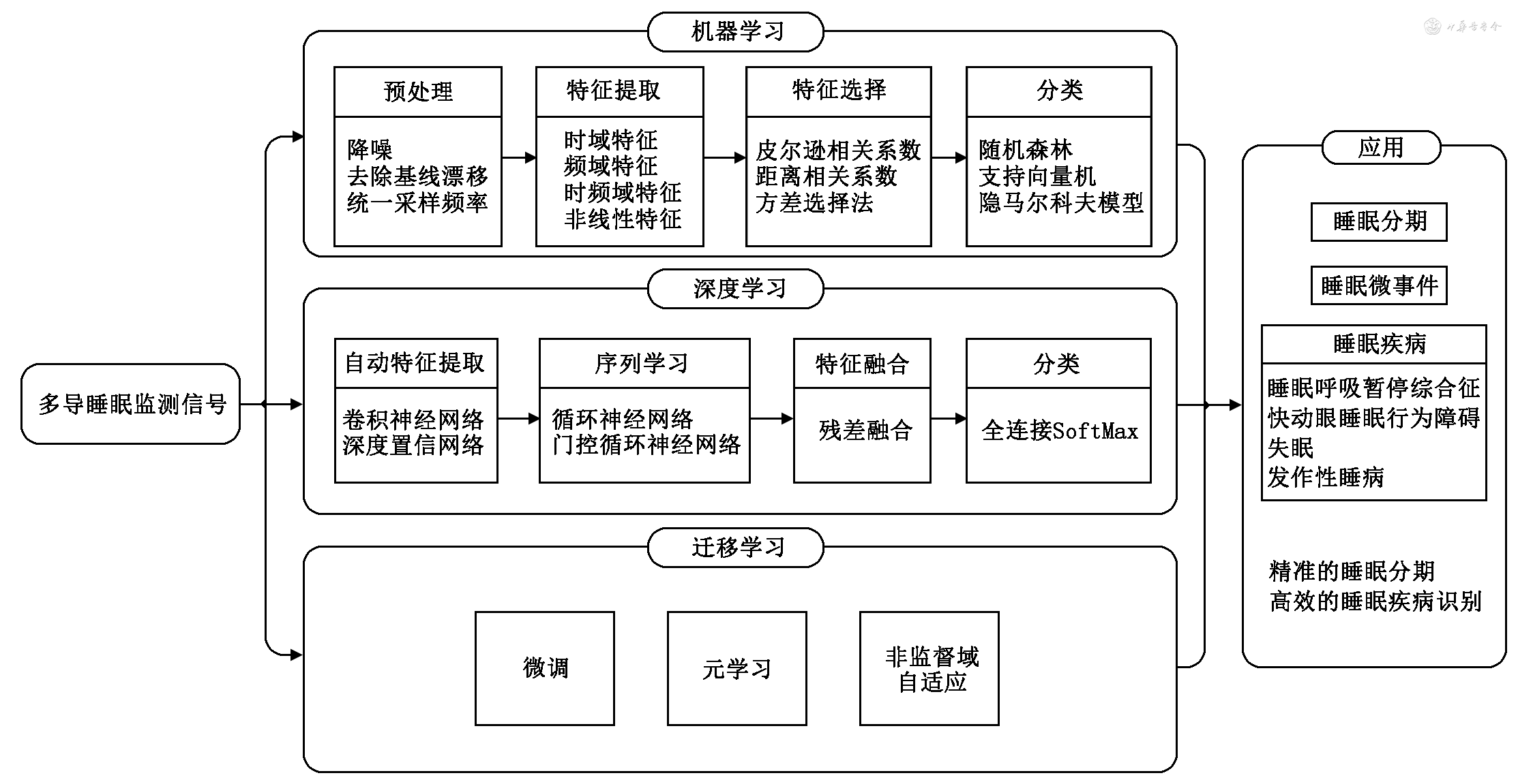 迁移学习可以利用已有的公开数据集对模型进行预训练,微调后再应用于新的睡眠数据分析,有效处理由于多中心、不同采集设备、不同配置等引起的数据一致性差的问题,并提高模型的可用性,而且可以有效节省人工标注样本的时间。